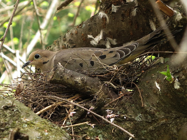 We have a Mourning Dove nesting in our weeping cherry tree.