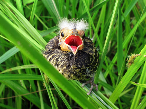 Grandson Reed and I were at our cabin pond today looking for "Free Range" turtles when we noticed a pair of red winged blackbirds making several trips to some tall grass. Thinking there may be a nest in the area we went over for a look. We didn't find the nest but did find these 3 fledgling birds in the tall grass.